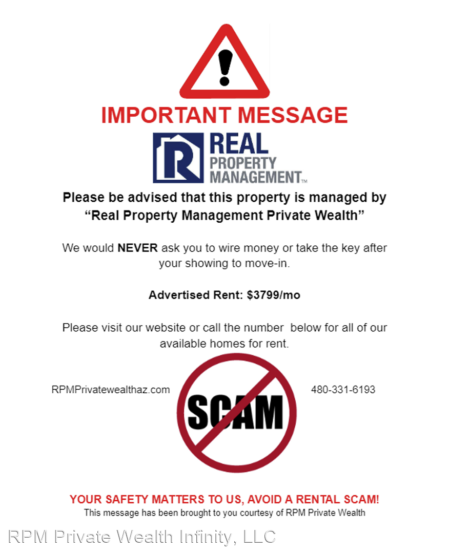 COMING SOON! Luxurious Oasis: 4 Bed, 3 Bath Home with Pool, Expansive Backyard, and Stylish Upgrades - This remarkable property offers an ideal combination of comfort, style, and luxury. Boasting four bedrooms and three bathrooms, this spacious home is designed to accommodate a modern family with ease. The centerpiece of this remarkable property is the expansive backyard, featuring a sparkling pool that invites you to cool off during the warm Arizona summers. The large lawn provides ample space for outdoor activities, while a charming fireplace creates a cozy ambiance for gathering with loved ones during cooler evenings. Step inside to discover the grandeur of vaulted ceilings, which create an airy and open atmosphere throughout the home. The well-designed open kitchen floor plan is perfect for entertaining guests and allows for seamless interaction with family and friends. The kitchen itself is a work of art, boasting exquisite finishes and modern appliances, making it a true haven for culinary enthusiasts. In addition to its impressive features, this property offers the convenience of a three-car garage, providing ample parking and storage space. With its attention to detail and thoughtful design, this home truly exemplifies the essence of luxurious living. Don't miss the opportunity to make this exceptional property your own. All pets must be approved by management. This property will be unfurnished. Washer/Dryer hookup only. THIS PROPERTY IS OCCUPIED DO NOT DISTURB THE TENANT The property owner and RPM will not service the built in barbeque, rented in as is condition. PLEASE BEWARE OF SCAMMERS! RPM WOULD NEVER ASK YOU TO WIRE FUNDS. TEXT ONLY 480.331.6193 WITH ANY QUESTIONS. Total monthly rent payment is approximately $3944.00, which includes city rental tax and an administration fee. Tenant pays all utilities, monthly landscaping and weekly pool service are included in the monthly rent. A minimum refundable security deposit of $3799.00 is due within 48 hours of signing lease agreement. First month's rent and non-refundable $200 administration fee is due on lease start date. Rent will be prorated if lease start date is after the 1st day of the month. Application Fee is $60 for the first adult occupant and $30 for each additional adult applicant. An application fee is not paid until we actually begin processing your application. To qualify for our properties we require the following: * Please see information below regarding Criminal History * No Evictions in last 3 years (and no current judgments) * Monthly combined gross income of 3x the rental amount * A Credit Score of 540 or higher * No un-discharged bankruptcy * Proof of income at least 3x the monthly rent * Verifiable rental history including proper notice to previous landlord If you meet this criteria and would like to move forward with applying, we need the following to move forward with the application: * Application can be filled out online at www.rpmprivatewealthaz.com * Non-refundable Application fee is $60 per adult applicant and $30 for each additional adult applicant. Application fee can be paid online. * Copy of each adult applicants picture ID * One month of pay stubs (showing 3 times the monthly rent in gross income) * Applicant disclosure form * Rental history form CRIMINAL HISTORY: Not only must Applicant have acceptable credit history, additionally, all Applicants must meet our Criminal History Criteria. Applicants that are registered sex offenders will be denied. Applicants must have no felony convictions less than 10 years old that involve violent crimes against persons or property, including but not limited to murder, arson, kidnapping, assault, bomb related offenses, robbery or burglary, terrorism OR that involve the manufacturing or distribution of drugs in any manner. All other felony convictions must be more than 5 years old. Conviction of any drug related offenses involving possession only, or alcohol related offenses where no one was permanently injured or killed, must be at least 2 years old. Successful completion of any felony sentence at least 2 years ago and no new criminal activity for at least 2 years before this application is also required. No Applicant with any outstanding warrants or crime that is awaiting trial will be accepted. Please check our website for more homes. RPMprivatewealthaz.com.